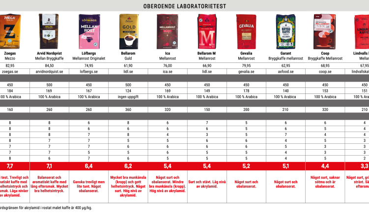 För att avgöra om det finns några större hälsorisker kopplade till akrylamid vid kaffepausen bad Testfakta det oberoende laboratoriet Eurofins analysera akrylamidhalt i de tolv olika kaffesorterna. Resultatet visade att ingen av sorterna kommer upp i de EU-begränsade åtgärdsnivåerna på 400 μg/kg, även om Lidls Bellarom ligger ganska högt med en akrylamidhalt på 360 μg/kg. Samtidigt visade testerna att akrylamidhalten i den färdiga kaffedrycken ligger ännu lägre – bara en tiondel av akrylamidinnehållet tar sig igenom kaffefiltret. Så slutsatsen är att det går fint att fortsätta dricka bryggkaffe i svenska mängder.