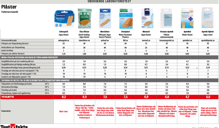 Testfakta gav franska laboratoriet Eurofins ATS i Aix-en-Provence uppdraget att testa åtta vattenresistenta plåster på den svenska marknaden.