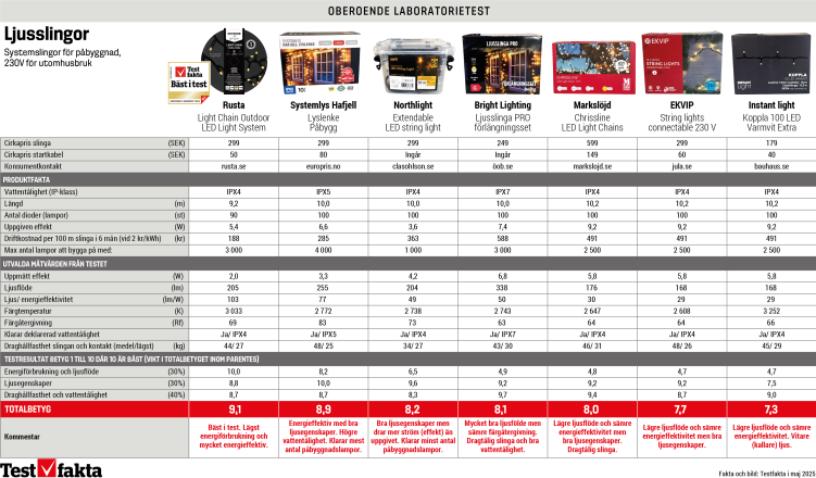 Testfakta har låtit det oberoende svenska testinstitutet RISE testa sju olika ljusslingesystem för utomhusanvändning som säljs på den nordiska marknaden. Ljusslingorna har genomgått en rad olika tester som bland annat omfattar ljusegenskaper, energiförbrukning, kvalitet, hållbarhet i sladdar, kopplingar och kontakter och hur väl de tål temperaturväxlingar. Testet har genomförts på uppdrag av Rusta AB.