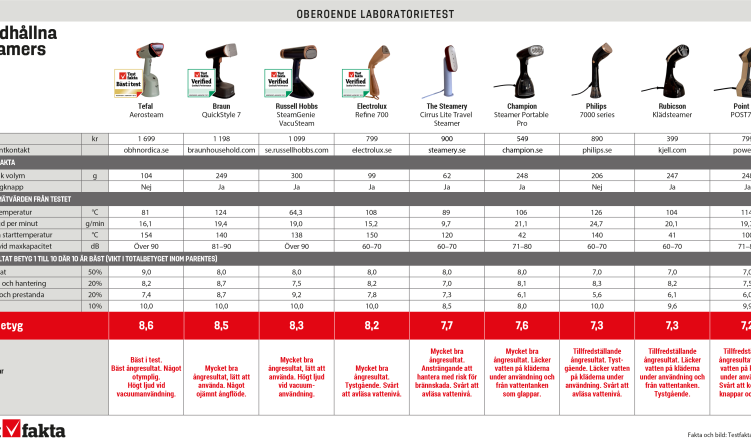 Testfakta har låtit det oberoende textillaboratoriet Weber & Leucht i Tyskland testa 9 vanliga modeller av handhållna steamers för att ta reda på vilka som levererar bäst resultat. Överlag var alla testade steamers bra på att släta ut skrynklor, även om Tefal och APT gjorde det allra bäst. Tefal har liksom Russell Hobbs en vacuumfunktion som kan slås på och av. När den är igång suger den in tyget mot ångplattan vilket gör ångningen enklare och mer effektiv när tyget ligger an mot hela plattan. Vacuumfunktionen bidrar till Tefals starka resultat i testet, men har ett ganska högt ljud. Även flera andra modeller presterar mycket bra i testet. Russell Hobbs, Braun, Electrolux och The Steamery får mycket höga betyg för sin utslätande förmåga.
