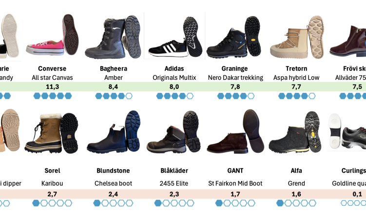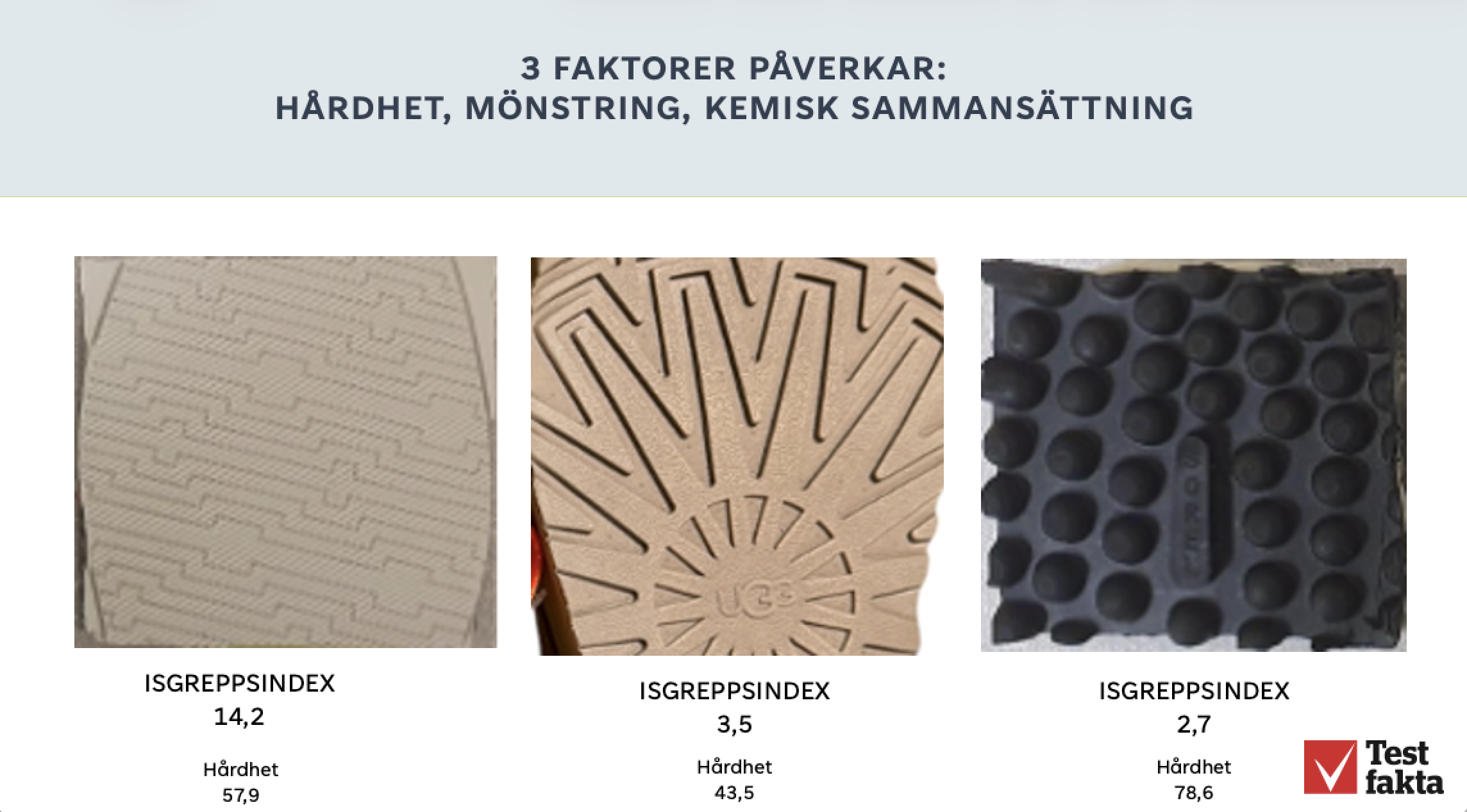 Den stora skillnaden i testresultat – från isgreppsvärden under 3 till över 14 – visar därför att skomodell och utseende inte säger särskilt mycket om verkligt isgrepp, utan att sulans funktion avgörs av en kombination av material, mönster och hur den beter sig i kyla.
