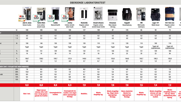 Sammantaget får Jack & Jones högst totalbetyg tack vare mycket god hållfasthet i sömmar, bra elasticitet och liten formförändring, tätt följt av Calvin Klein och Calida som också håller en hög och jämn kvalitet.