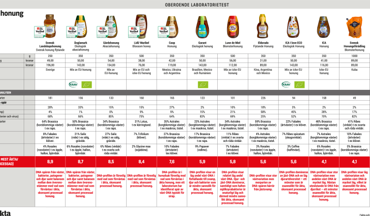 För att undersöka hur vanligt fusket är i Sverige har Testfakta låtit två oberoende laboratorier, Celvia i Estland och Sinsoma i Österrike, analysera tolv flytande honungar med hjälp av ny, avancerad DNA-teknik.