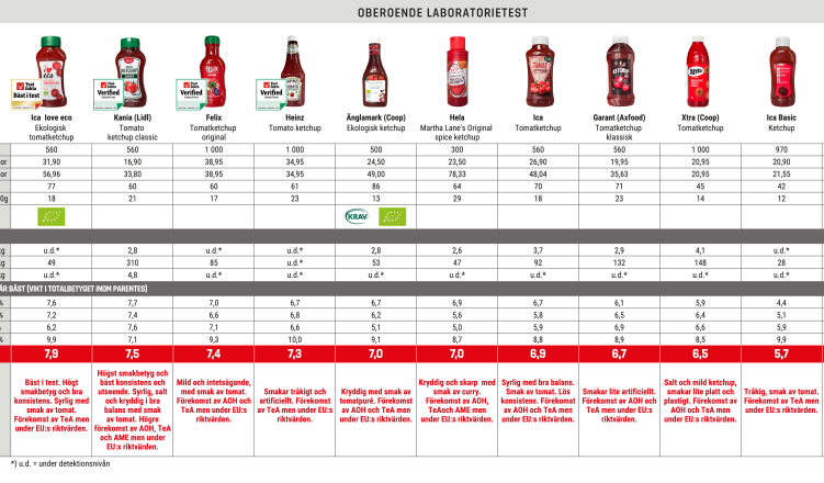 Testfakta lät också genomföra ett smaktest av de tolv ketchupsorterna för att ta reda på vilka märken som uppskattas mest. Studien genomfördes av studenter och personal på restaurang- och hotellhögskolan Måltidens hus i Grythyttan som bedömde produkterna på en tiogradig skala. Resultaten visar tydliga skillnader mellan märkena – från klara favoriter till några som inte alls föll testpanelen på läppen.
