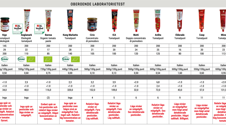 Under hösten fick Testfakta in flera larmrapporter från utlandet om förhöjda halter av mögelgifter i processade tomatprodukter. För att se hur det ser ut på den svenska marknaden samlades 14 vanliga fabrikat av tomatpuré in från livsmedelshandeln.